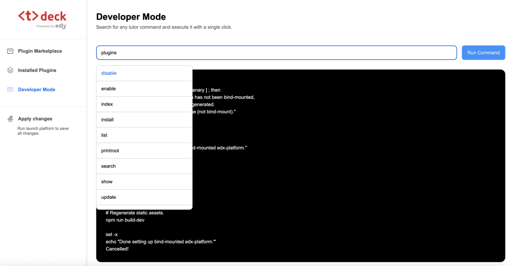 بالنسبة للمطورين والمستخدمين المتقدمين، يتضمن Tutor Deck أيضًا وضع المطور مع واجهة سطر أوامر مدمجة (CLI).