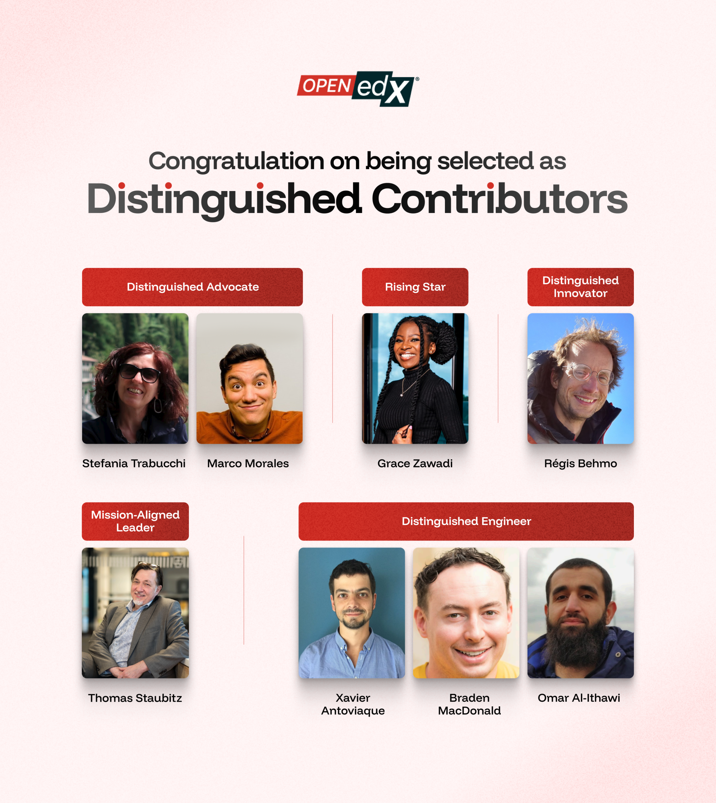 Estamos profundamente agradecidos a los homenajeados de este año por su dedicación, liderazgo y esmero en el avance de la misión de Open edX.